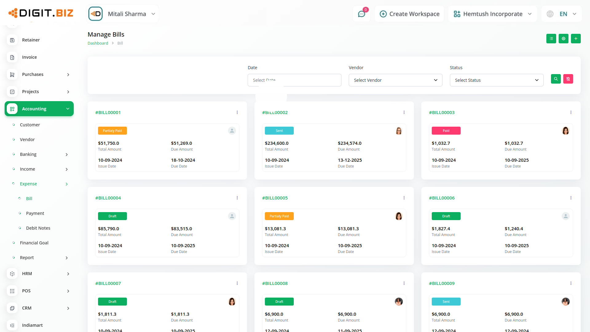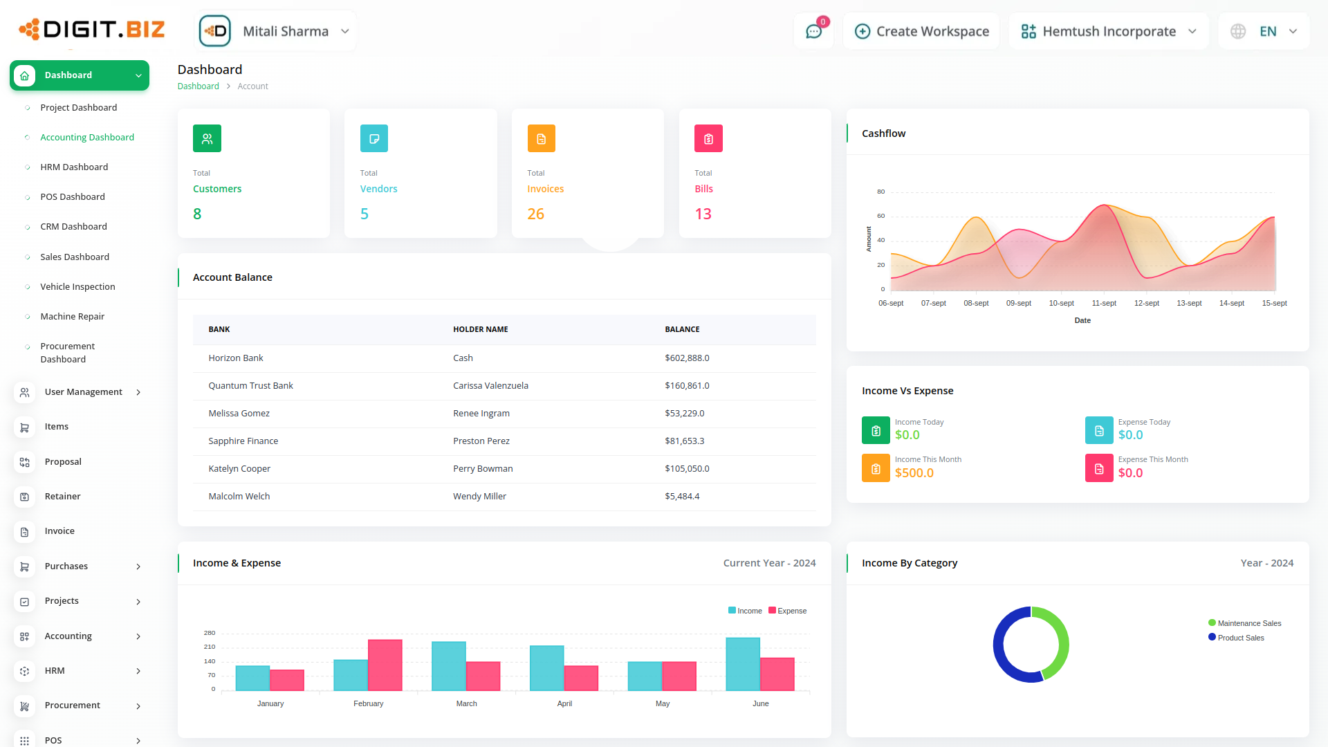 A budget is a financial plan for a specified period to keep in check with the working capital. This feature here helps to maintain the capital flow. You can set monthly, quarterly, half-yearly, or yearly budgets according to your business plans and needs. The main categories are “Income” and “Expense” where one can edit /update /delete the sub-categories as well.
