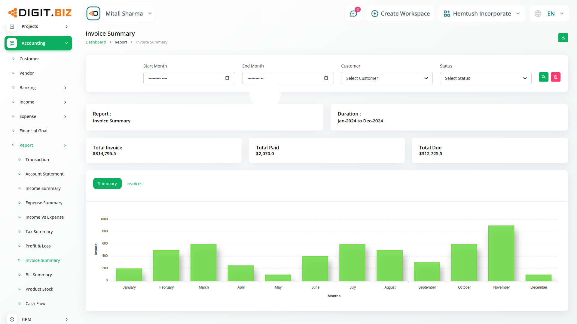 Get a report on transactions with an easy filtering option. Download the required account statements in either PDF, CSV, or Excel format. You get duly prepared reports on individual Income, Expenses, Tax, Invoice, and bill summary. Filter them based on Account, category, and customers. Also, a graphical display of the Income VS Expense chart along with a detailed calculation of Profit and Loss will help you make informed decisions. Filter the tax summary and Income VS Expense chart based on financial years.