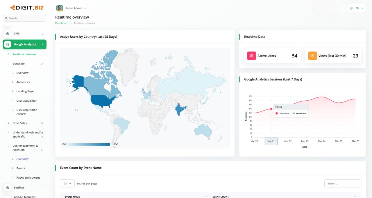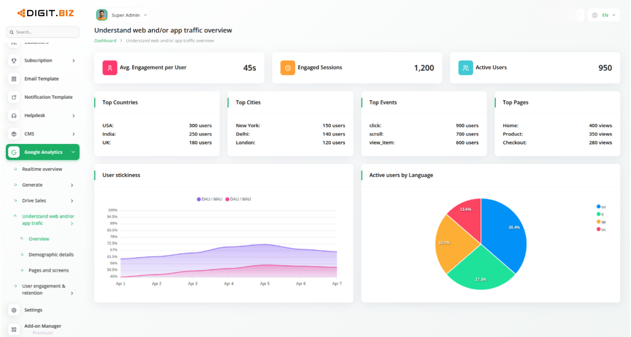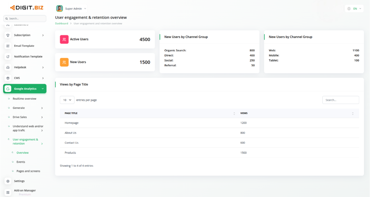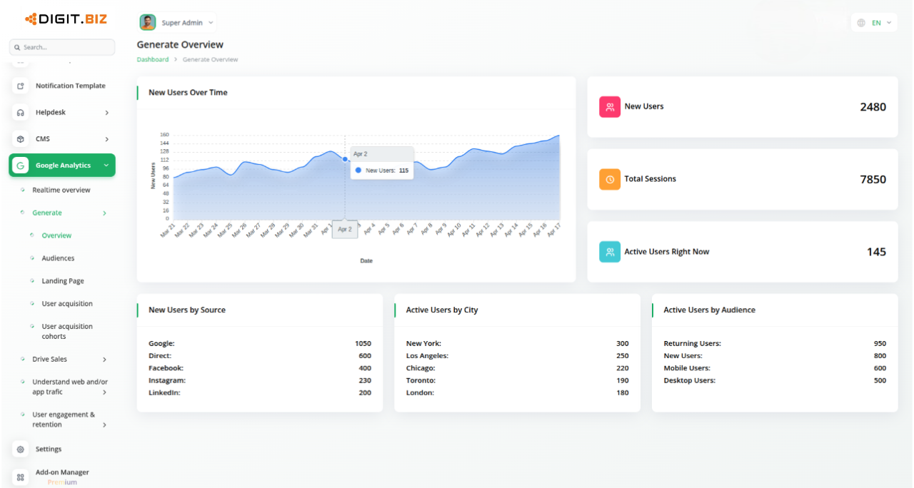 The Google Analytics feature seamlessly integrates powerful insights into your dashboard, giving you real-time visibility into website traffic, visitor geography, and device usage—all without leaving the platform. With easy setup and live syncing from Google Analytics, you can monitor performance, track user behaviour, and optimise strategies in one centralized space.